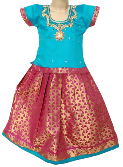 Pattu Pavadai set Readymade - 5 to 10 years (குழந்தைகளுக்கான பட்டுப்பாவாடை) - Greenish Blue, Red(Pink Shade)